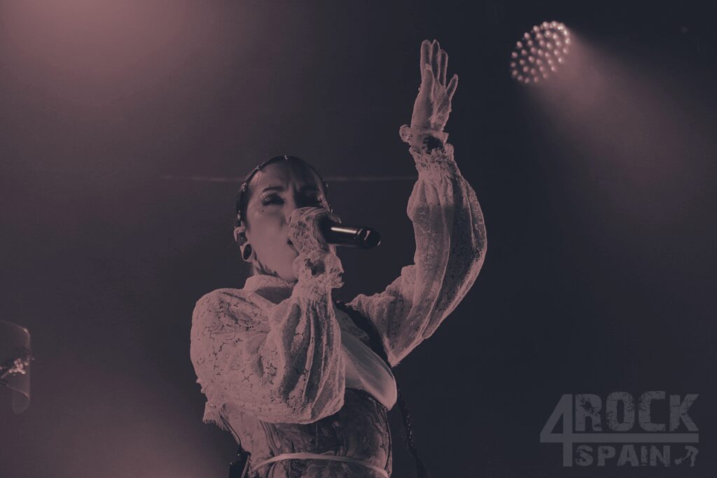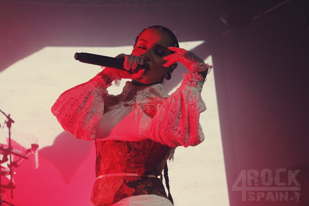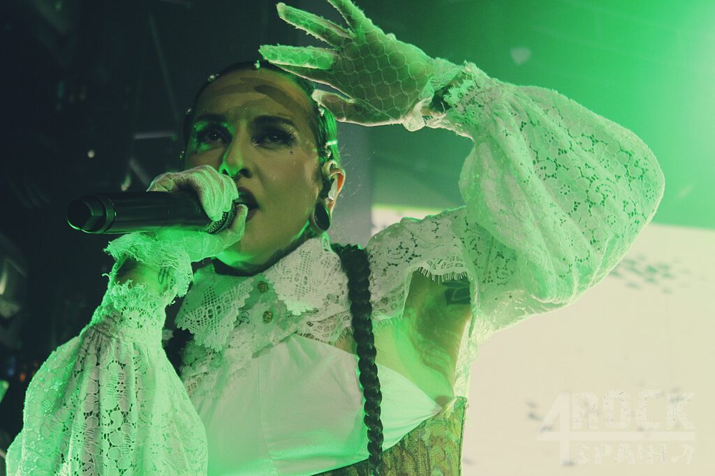 Con la sala completamente abarrotada desde mucho tiempo antes, a las 20:15 hicieron Jinjer su aparición sobre las tablas. Primero lo hicieron Roman Ibramkhalilov (guitarra), Eugene Abdiukhanov (bajo) y Vlad Ulasevich (batería), todos ellos vestidos sobriamente de negro, como queriendo no destacar y asumir el papel de figurantes en una función que está diseñada para el lucimiento de la diva que comanda la banda. Los nervios contenidos entre el personal estallan cuando Tatiana Shmaylyuk aparece radiante en su vestido blanco con aires étnicos de su tierra. Una puesta en escena pensada para que todos los ojos se dirijan a Tatiana, es inevitable, pero aunque así sea en el aspecto visual, no creo que haya nadie que obvie el espectacular trabajo que hacen sus compañeros en cada uno de los instrumentos que tocan, siendo todos unos virtuosos en lo suyo.