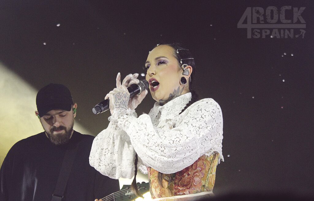 Con una discografía tan amplia y compleja como repleta de matices, es lógico que su último disco, «Duél», fuera el que copara el mayor protagonismo en el set. La mitad del mismo, para ser exactos. Siendo la homónima que abrió la velada, y los singles «Green Serpent», «Kafka» y «Someone’s Daughter» los temas más celebrados. La música de Jinjer no es precisamente fácil, lo que hace más sorprendente y meritorio su éxito, y además va acompañada de una cuidada puesta en escena, tan sencilla como efectiva, con varias pantallas en las que se proyectan sus lyrics videos o imágenes acordes a los temas, incluida la que cubre la plataforma sobre la que Vlad Ulasevich preside la ceremonia a los mandos de su batería. Tatiana vibró e hizo vibrar en todas y cada una de las canciones, dejándose el alma y los pulmones, incluso teniendo que apartarse alguna vez del micro para toser. No sé si fruto de la exigencia de su música o si de un catarro, ambas opciones son plausibles cuando estás metido en una gira tan extensa y exigente como la que están llevando a cabo.