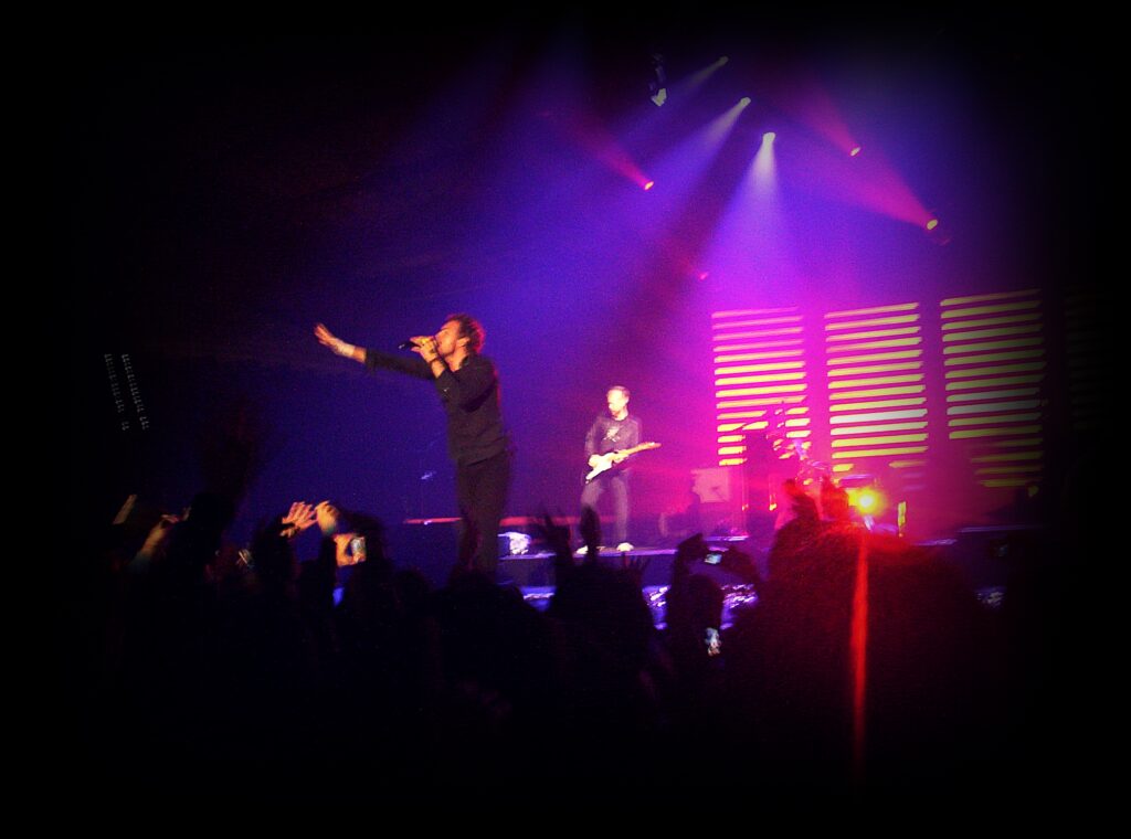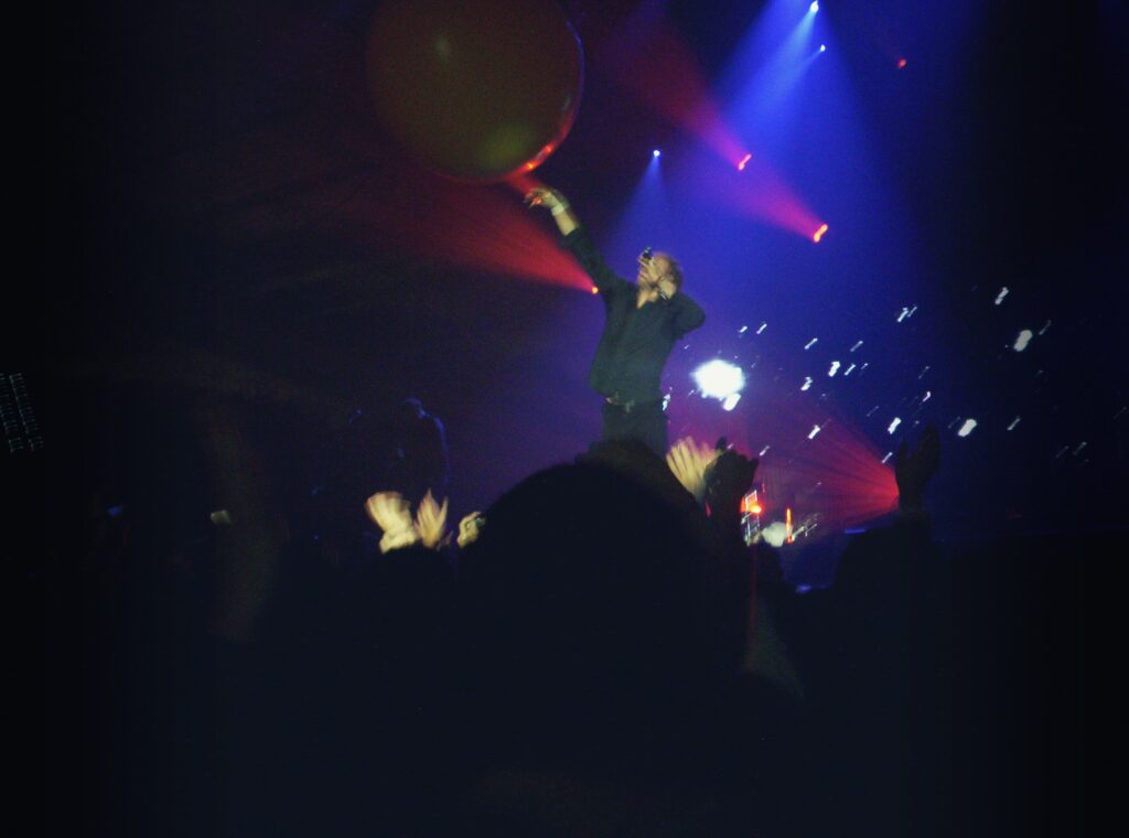 Y el 25 de noviembre de 2005 llegó el día. El Twisted Logic Tour fue la gira mundial realizada por Coldplay para promocionar su tercer álbum de estudio, «X&Y», publicado en junio de 2005, y tuvo su parada en San Sebastián aquel día, intercalada entre las de Madrid y Barcelona. Allí que me fui con mi entrada adquirida en formato físico con meses de antelación. Otros tiempos, otras compañías… Otro todo. Por la calidad de las fotos con las que lo ilustro es daréis cuenta. Lo que no ha cambiado, ni cambiará, es el tiempo de perros que hace por allí en esas fechas. La espera en los aledaños del velódromo de Anoeta bajo una lluvia persistente y un frío considerable no hacía sino añadir épica a la cita. Una vez se abrieron las puertas, entramos prestos a ocupar un lugar preferente frente al escenario que acogió a los también ingleses Goldfrapp como teloneros. Después de su actuación y para hacer tiempo hasta la aparición del cuarteto londinense nos fueron proyectando videos cargados de moralina con múltiples famosos diciéndonos cómo tenemos que vivir y demás. Mira, eso tampoco ha cambiado… El caso es que una vez que dieron el pistoletazo de salida y Chris Martin apareció corriendo por el escenario y saltando hasta el borde del mismo la euforia se desató en todo el recinto.